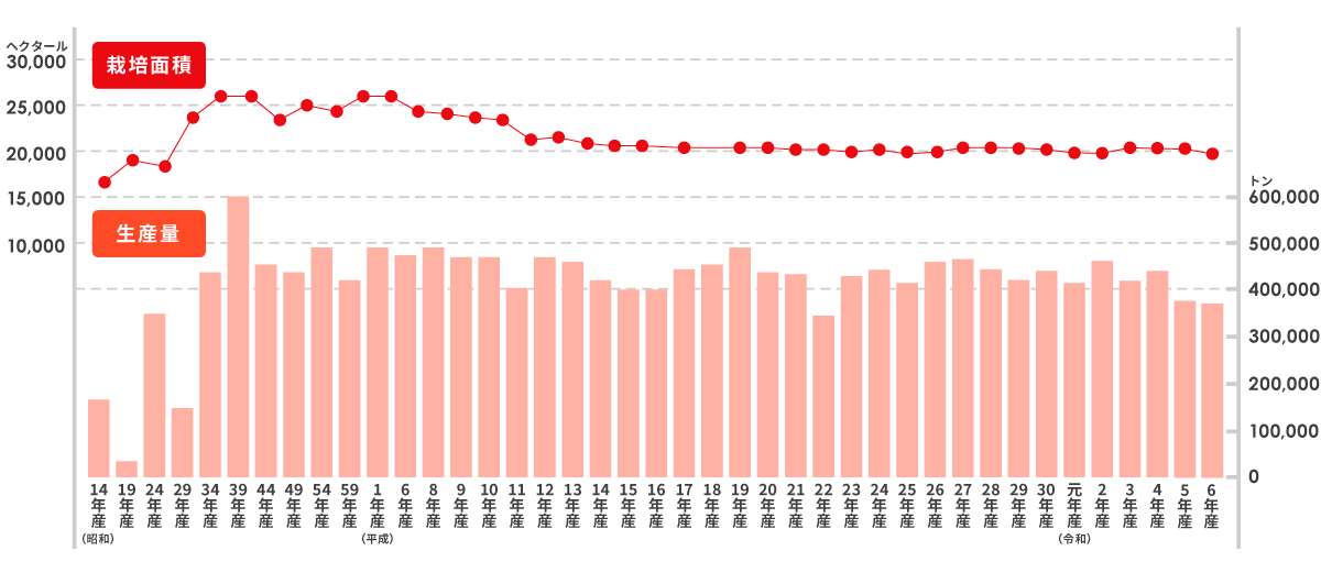 生産量:370,500トン(令和7年産)、栽培面積:19,800ha(令和6年産)